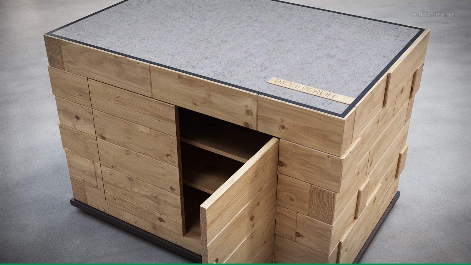 Im Auftrag der StudioNOW GmbH wurde ein mobiler, temporär einsetzbarer Infocounter für die Concept Shopping Mall “Bikini Berlin” konzipiert und gestaltet. Dieser Infocounter sollte nicht nur funktional, sondern auch ästhetisch perfekt auf das bestehende Innendesign und die Gestaltung der kleinen Läden innerhalb der Shopping Mall abgestimmt sein. Unser Designteam legte besonderen Wert darauf, die markanten Elemente wie massive Fichtenbalken, dicke Bolzen, pastellgrün lackierten Stahl und Drahtgitter in das Design des Counters zu integrieren.